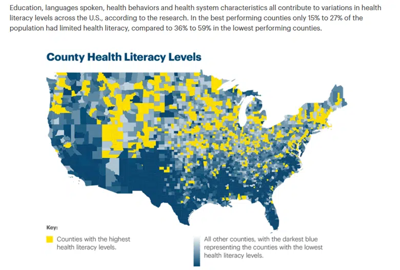 The US Department of Health and Human Services (HHS) defines health literacy as “the degree to which individuals have the capacity to obtain, process, and understand basic health information needed to make appropriate health decisions.” A survey conducted in 2020 by United HealthGroup found that health literacy varied greatly by county; in the best performing counties, just 15% to 27% of the population had limited health literacy, compared to 36% to 59% in the lowest performing counties.