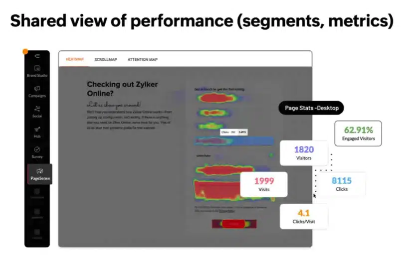 The platform also tracks quantitative information, performance, and uses elements like heat maps and scroll maps and session recordings to track qualitative things. Here’s a look at one of the Zoho Marketing Plus dashboards, that allows a quick glimpse into a project, showing everything from social posts to blog articles written, to email campaigns, ad campaigns, surveys and events, as well as A/B testing. It also allows the tracking of tasks and affords easy and simple collaboration among the various teams working on campaigns.