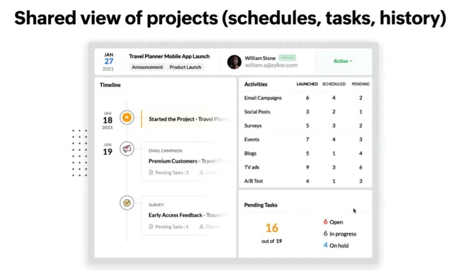 If you’re in marketing, chances are good you’re nodding, because this is the reality you’re living on a daily basis. In order to deliver — and to successfully juggle those many balls perpetually in the air — marketing teams need to be able to quickly and effectively collaborate, have access to the information they need, in real time, when they need it. That requires a shared view of the customer and easily accessible visibility for all into the progress of the team. That’s where the Zoho Marketing Plus Platform delivers.