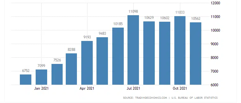 The so-called “Great Resignation” is continuing, with data from the U.S. Bureau of Labor Statistics indicating that the number of workers quitting jobs in November 2021 grew to 4.5 million, up from 4.2 million the previous month, and above the prior record of 4.4 million reached in September. And while the US Department of Labor said the number of job openings in the US decreased to 10.6 million in November 2021 from an upwardly revised 11 million in the previous month and below market expectations of 11.075 million, the level of openings remained near record highs with employers still having a difficult time finding workers.