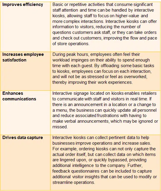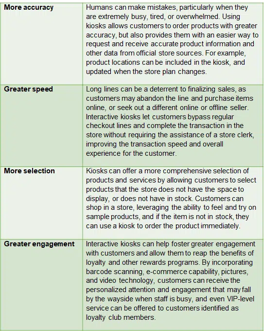 As a result, many industries are facing a significant shortage of in-person staff to handle sales, CX, and other customer-facing functions, which can have significant implications. A 2019 report published by Omnico found that 92% of US shoppers become frustrated when shopping in a store, with 86% annoyed by waiting for a refund, 52% angry about waiting to pay, and 49% ready to boil over if they are unable to find what they want. Kiosks, which have been used for years in airport terminals, fast food restaurants, and healthcare settings, can be used to improve CX by offloading the time-consuming and repetitive tasks that would prevent human workers from addressing more complex issues, or taking the time to create better experiences with customers. Although kiosks cannot and likely should not replace all human workers, they can provide significant benefits to both customers and employees, as detailed below, while somewhat lessening the demand for frontline staff.