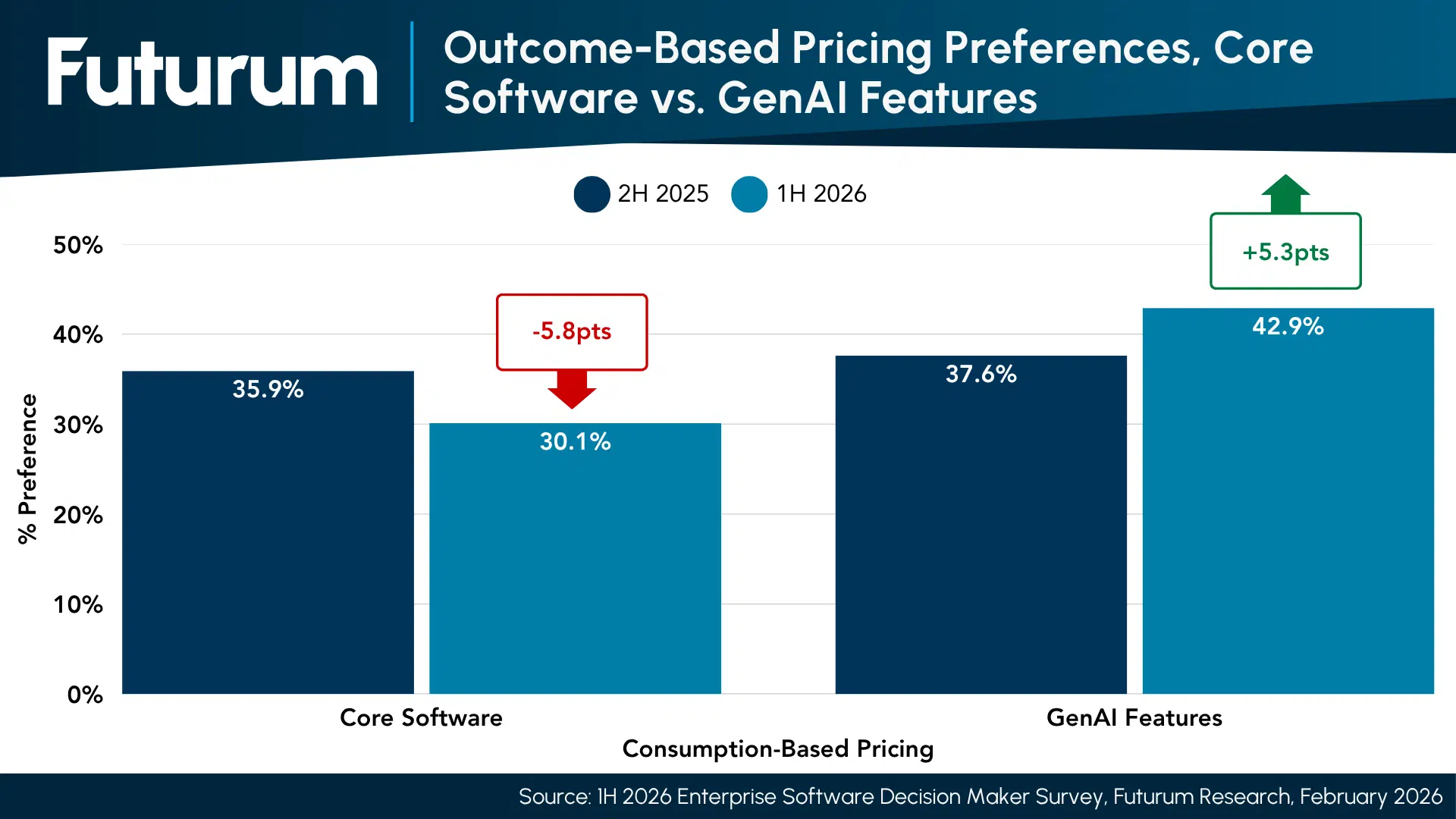 Figure 1: Outcome-Based Pricing Preferences, Core Software vs. GenAI Features, 1H 2026 vs. 2H 2025