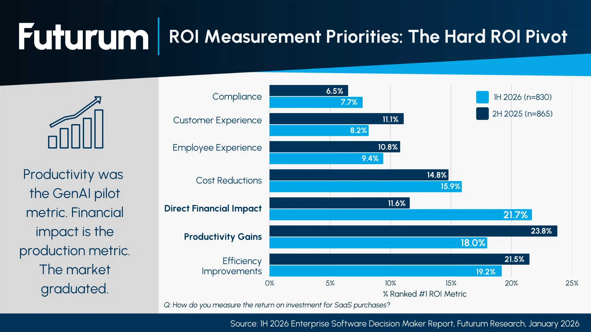 Futurum’s latest Enterprise Software Decision Maker Survey reveals enterprise AI ROI measurement is shifting from productivity to P&L impact, while agentic AI surged 31.5% as the fastest-growing technology priority among 830 IT decision makers.